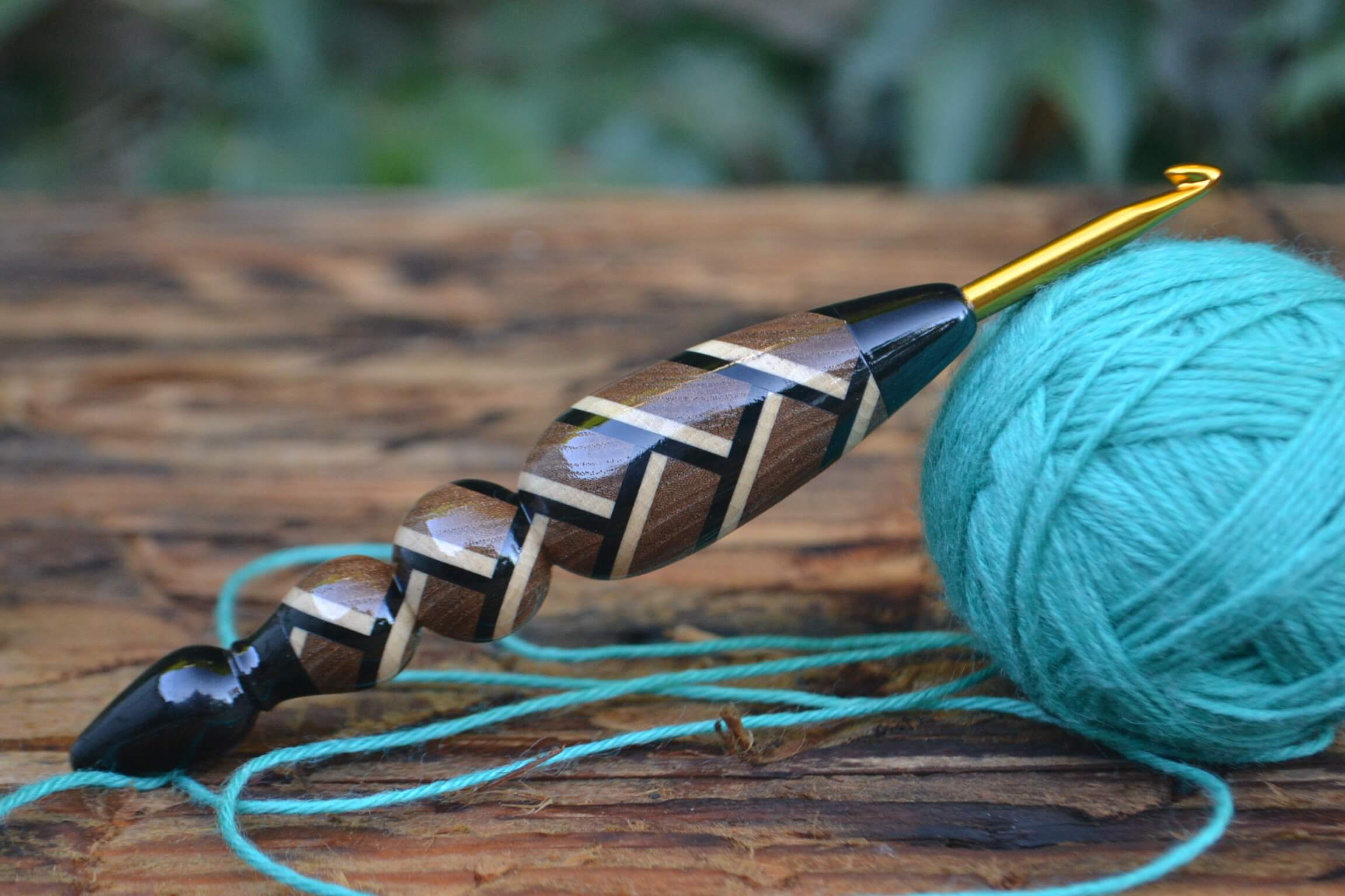 5 mm H Tulip Gold, Black Hornbeam and English Elm /Hornbeam wood mosaic Ergonomic Crochet Hook 24 mm 16 cm #1366-5056