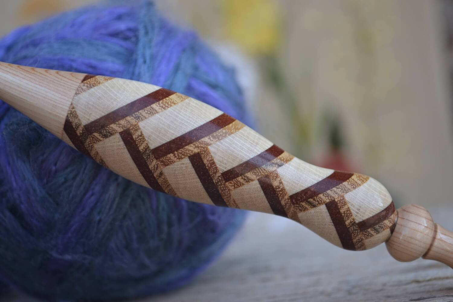 This 6mm handmade crochet hook blends precision and beauty. The handle is crafted from four types of wood: lilac, hornbeam, merbau, and robinia. Arranged in a herringbone or fish-scale pattern, the wood grain stands out beautifully. The tip and end are made of solid lilac wood, known for its density and durability. When exposed to sunlight, robinia wood fibers shimmer, creating a mesmerizing effect. The ergonomic shape ensures a comfortable grip, making crocheting effortless. Measuring 17cm in length with a maximum diameter of 23mm, this hook provides balance and control. A perfect tool for both beginners and experienced crocheters.