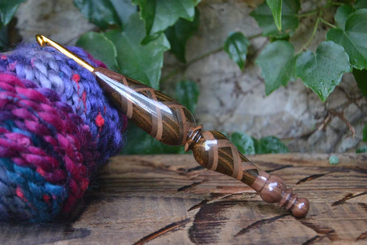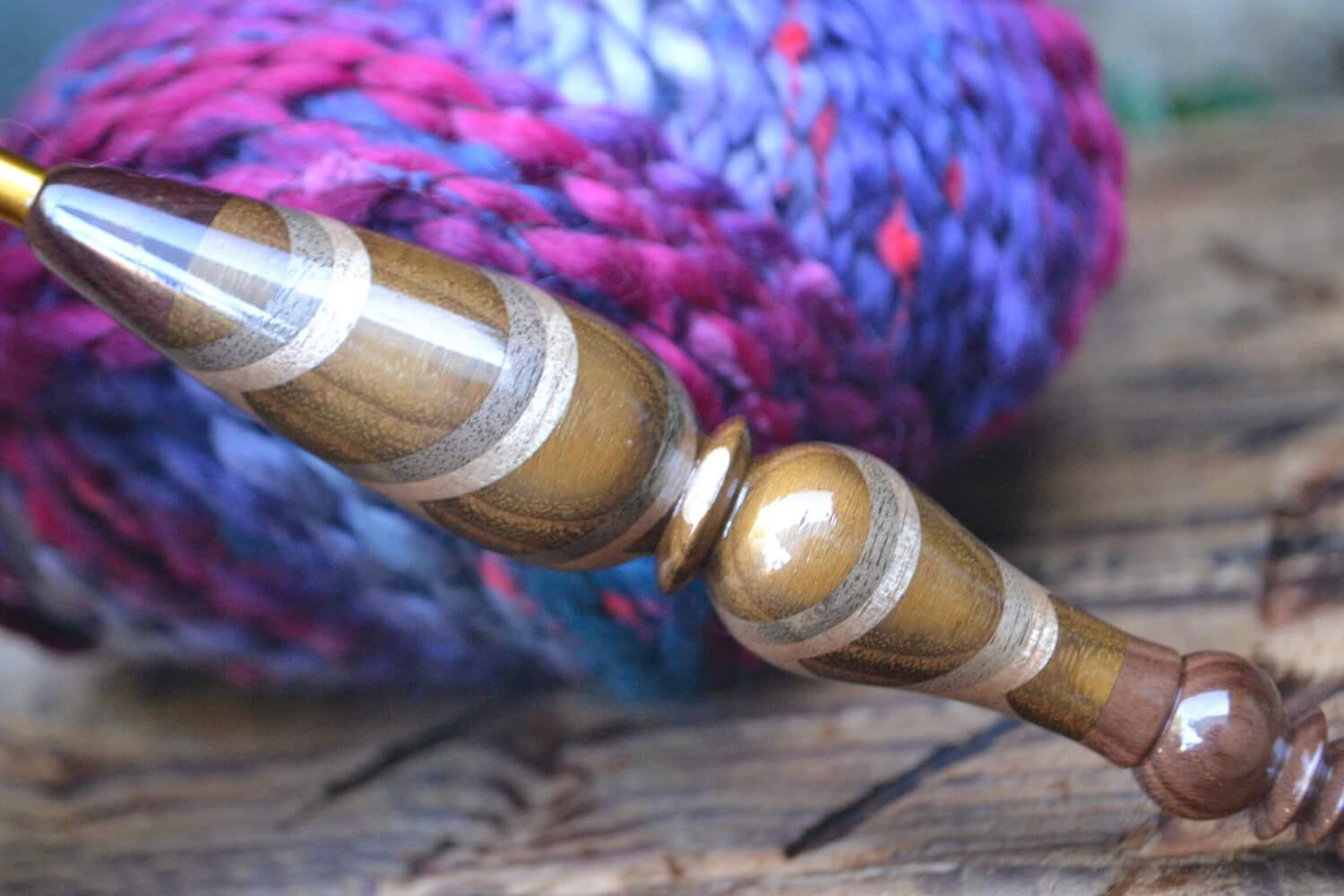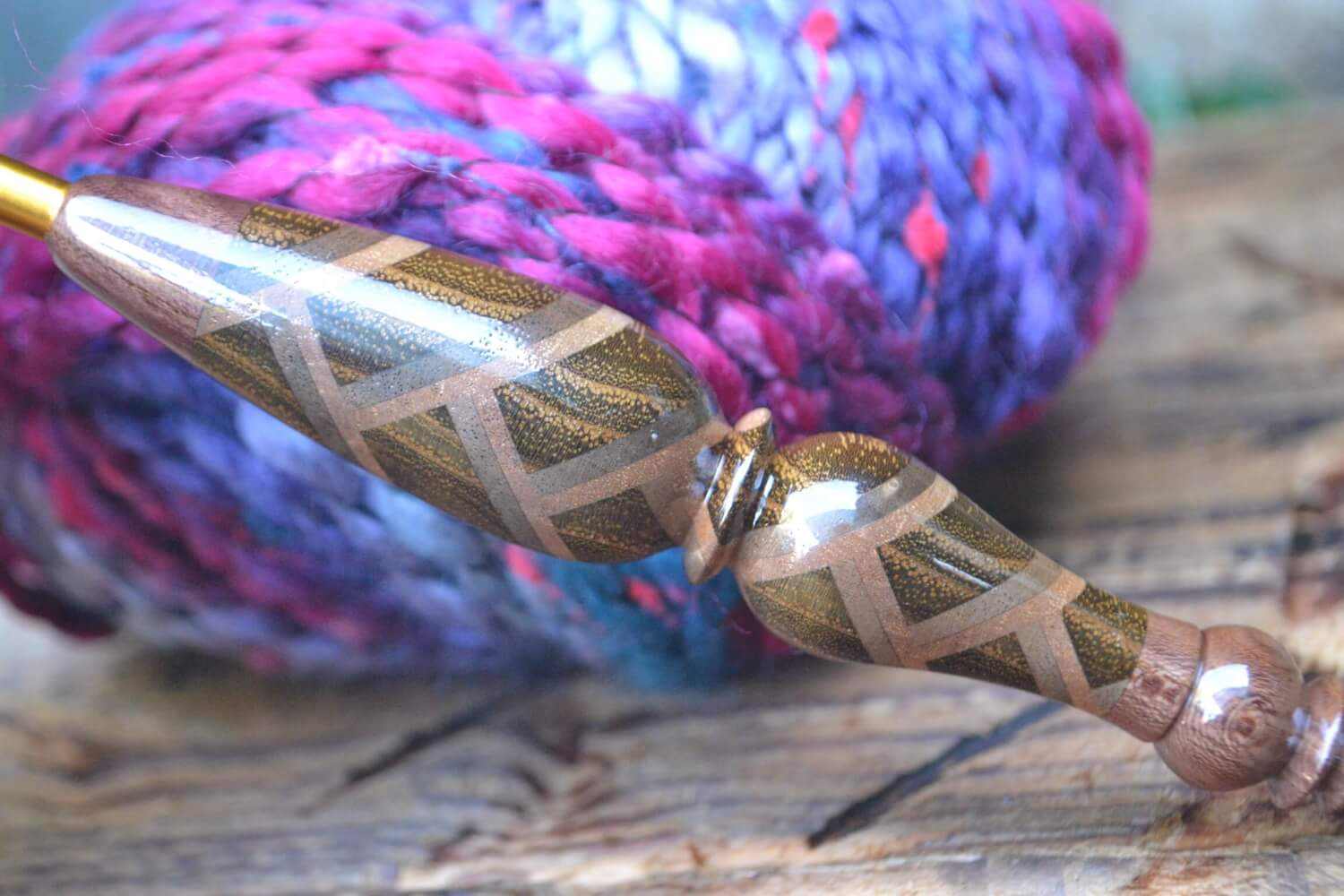 6 mm = size J Tulip Gold Rosewood Santos and Robinia / Ash / Walnut wood mosaic Ergonomic Crochet Hook 24 mm 17,5 cm #1325-5015