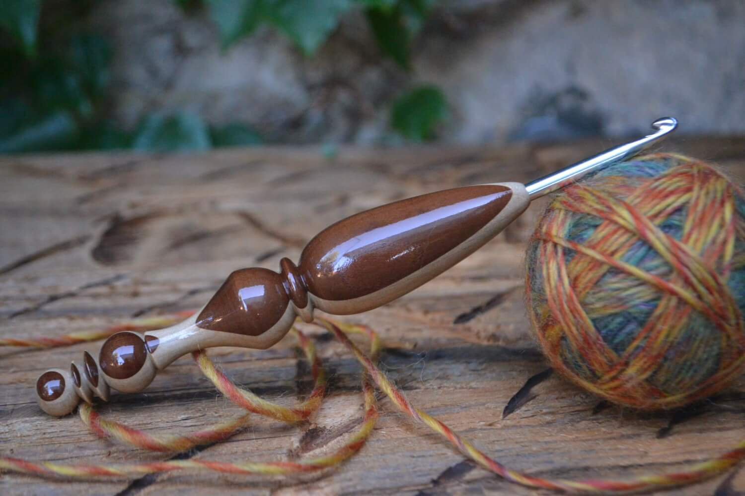 #1335-5025 4.5 mm (size 7) Prym hook, Hornbeam and Dark Apricot wood, 23 mm 17.5 cm