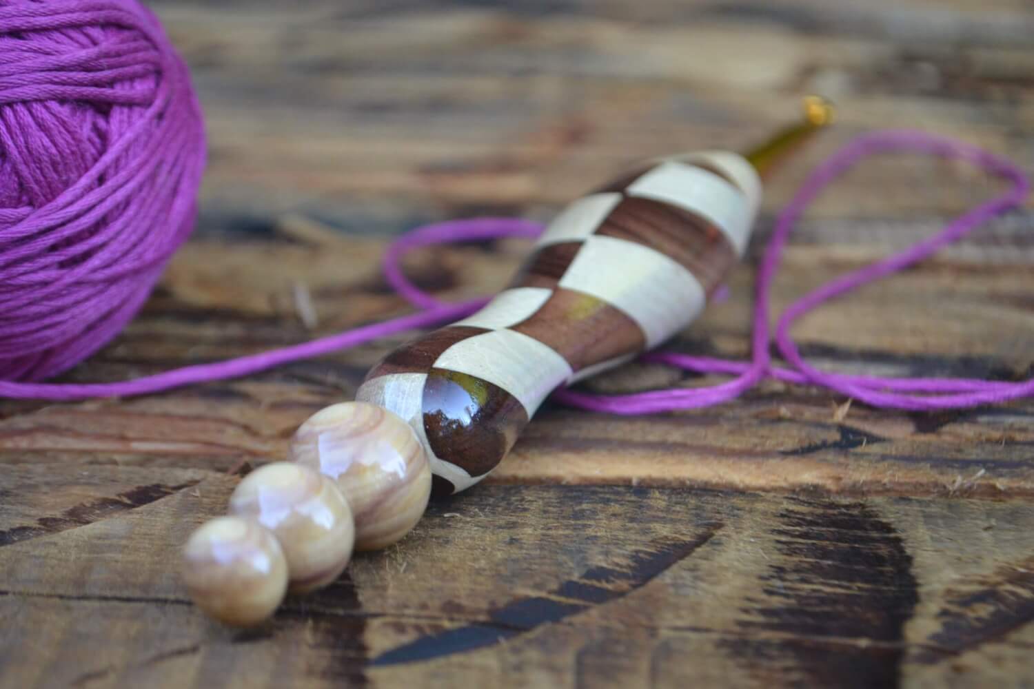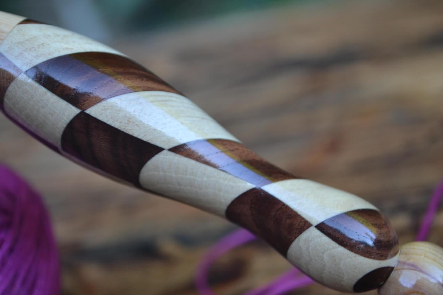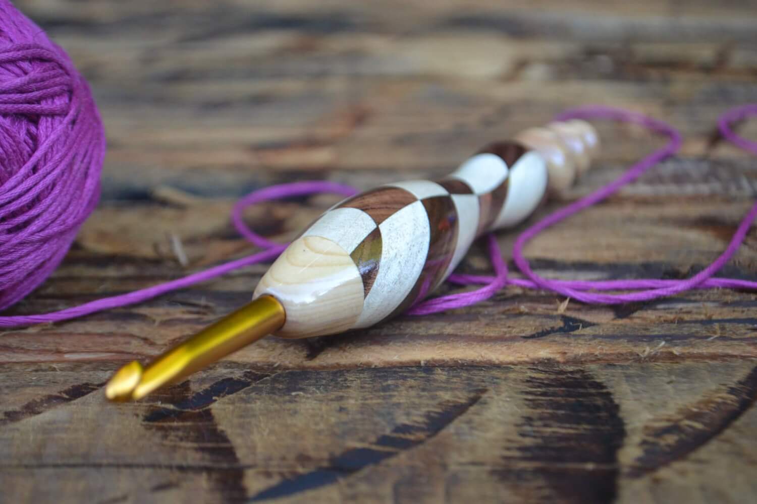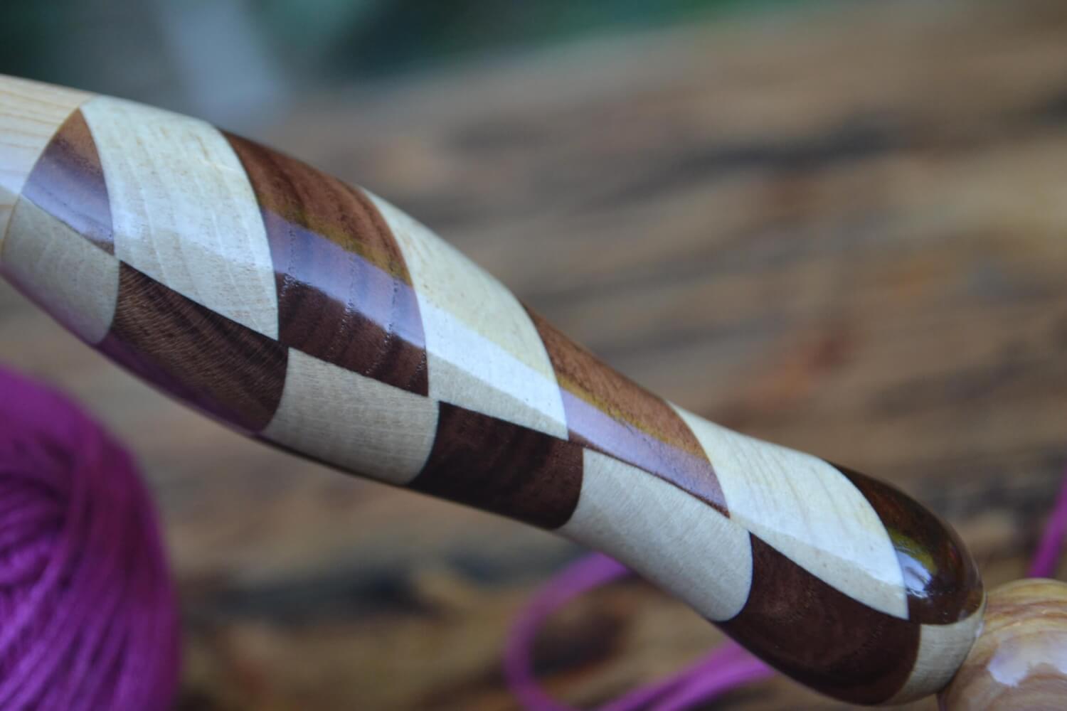 5 mm  = H Tulip Gold, Lilac and Dark Apricot /Hornbeam wood mosaic Ergonomic Crochet Hook 22 mm 16,5 cm #1362-5052
