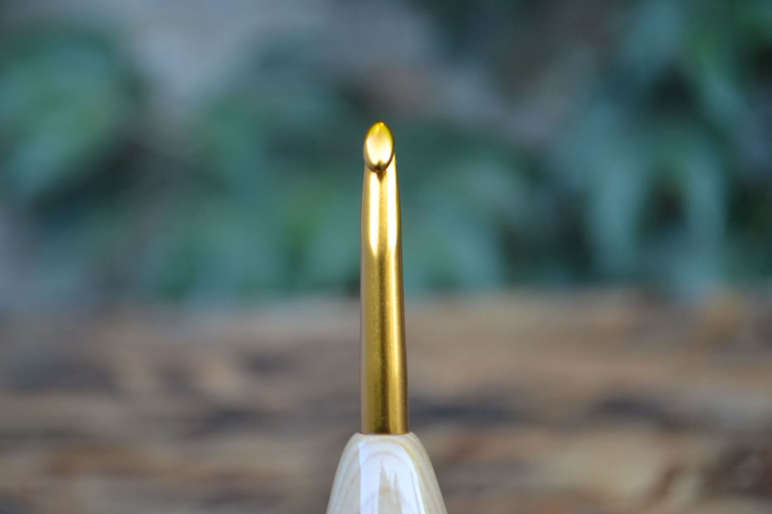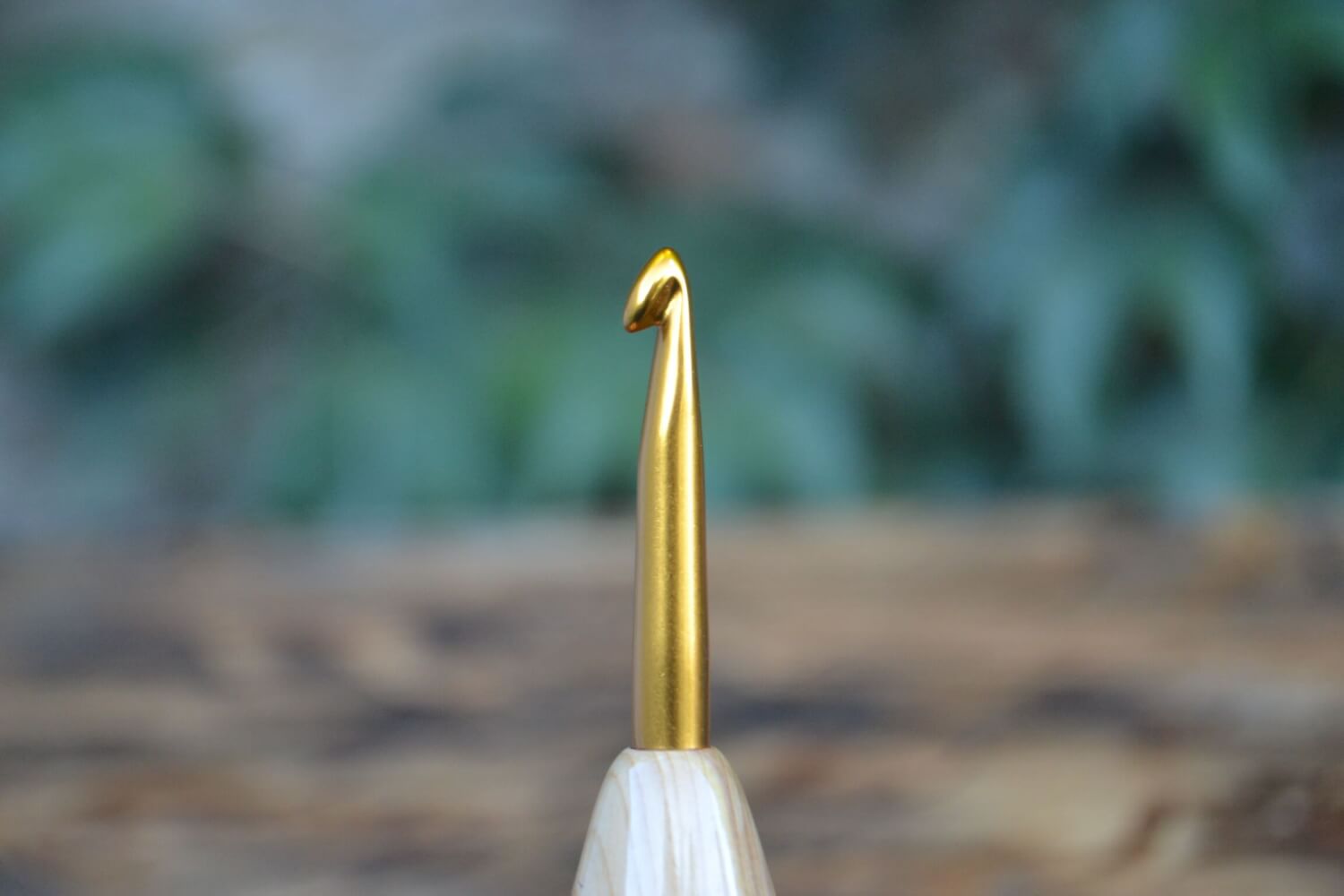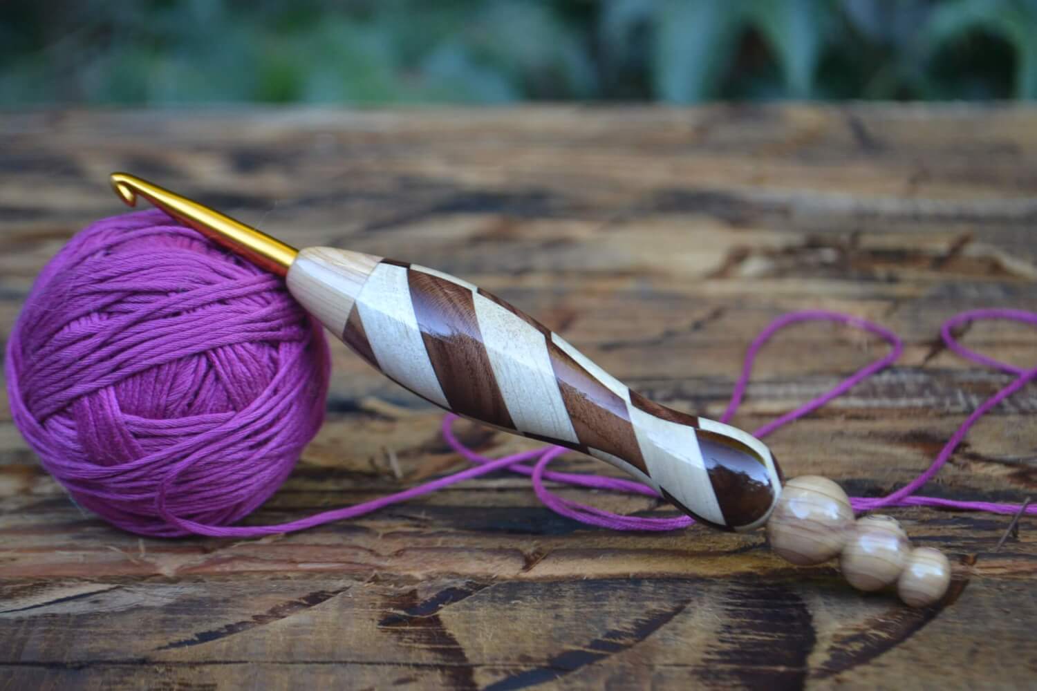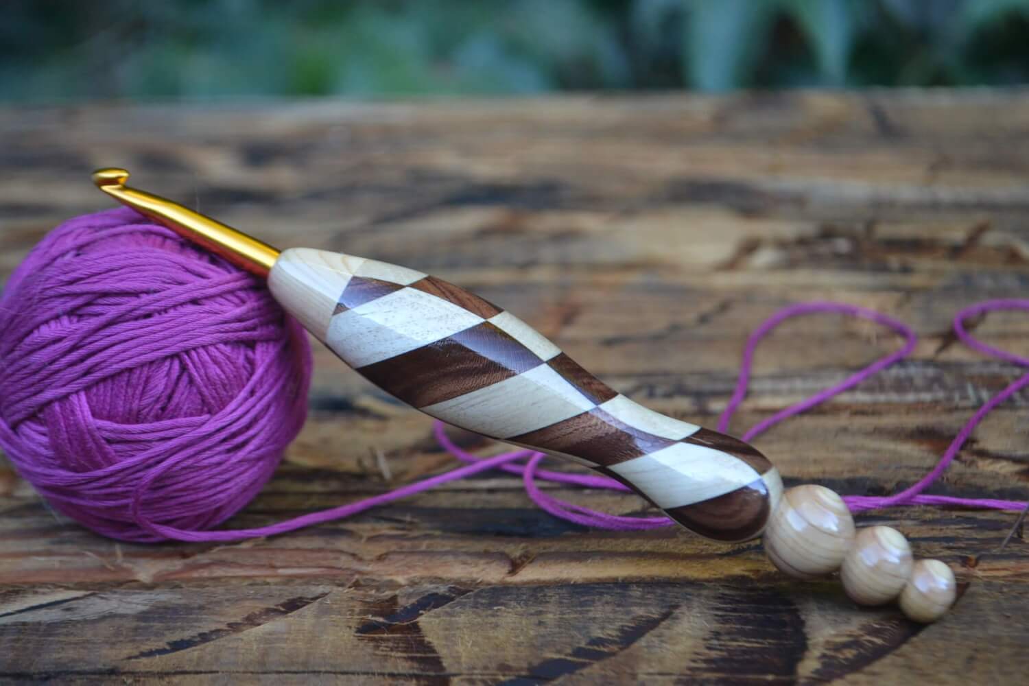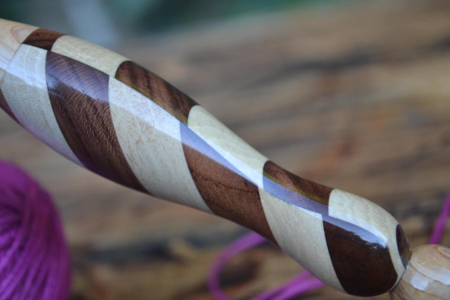 5 mm  = H Tulip Gold, Lilac and Dark Apricot /Hornbeam wood mosaic Ergonomic Crochet Hook 22 mm 16,5 cm #1362-5052