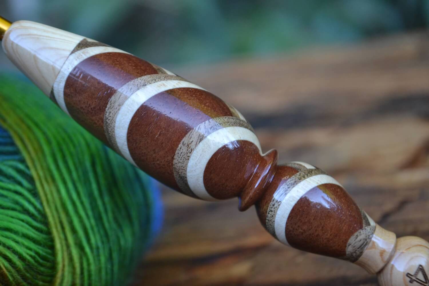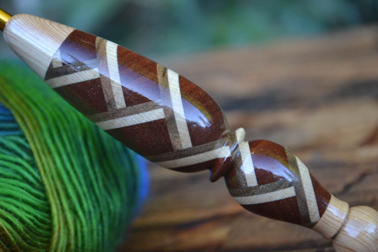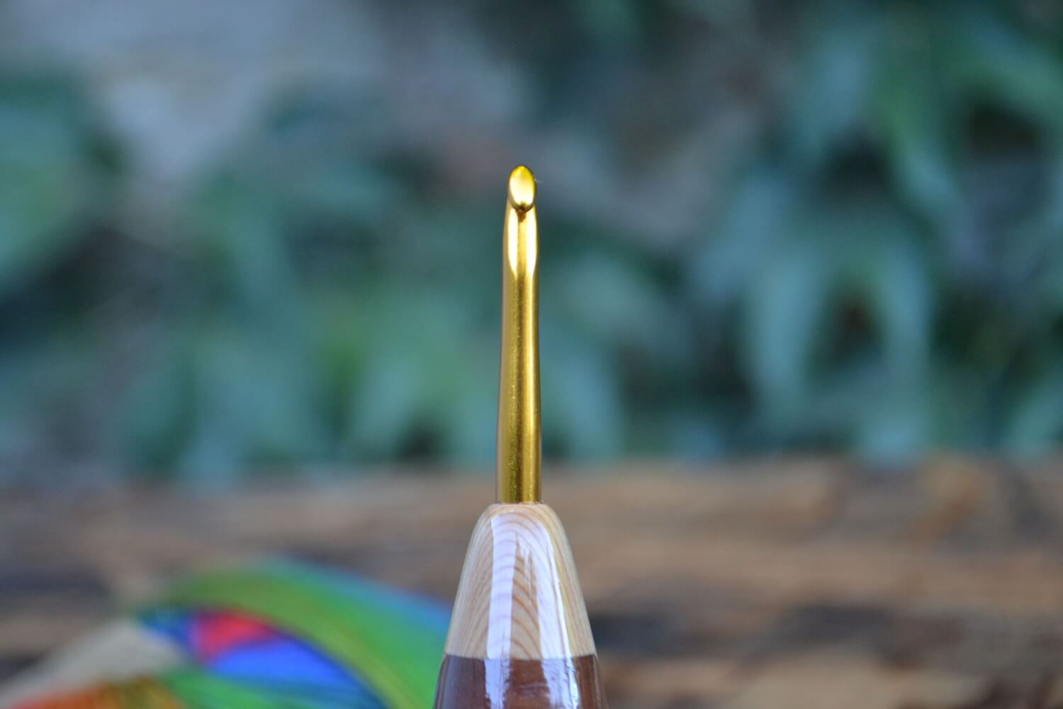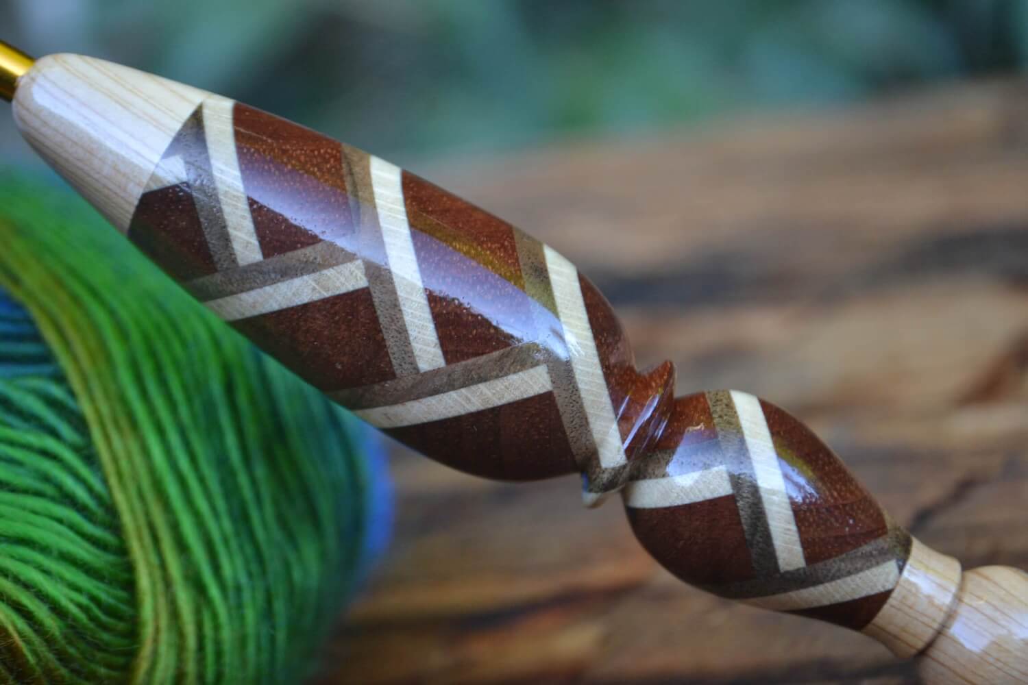 4 mm G Tulip Gold, Lilac and Merbau/ Walnut/ Hornbeam wood mosaic Ergonomic Crochet Hook 24 mm 16.5 cm #1369-5059