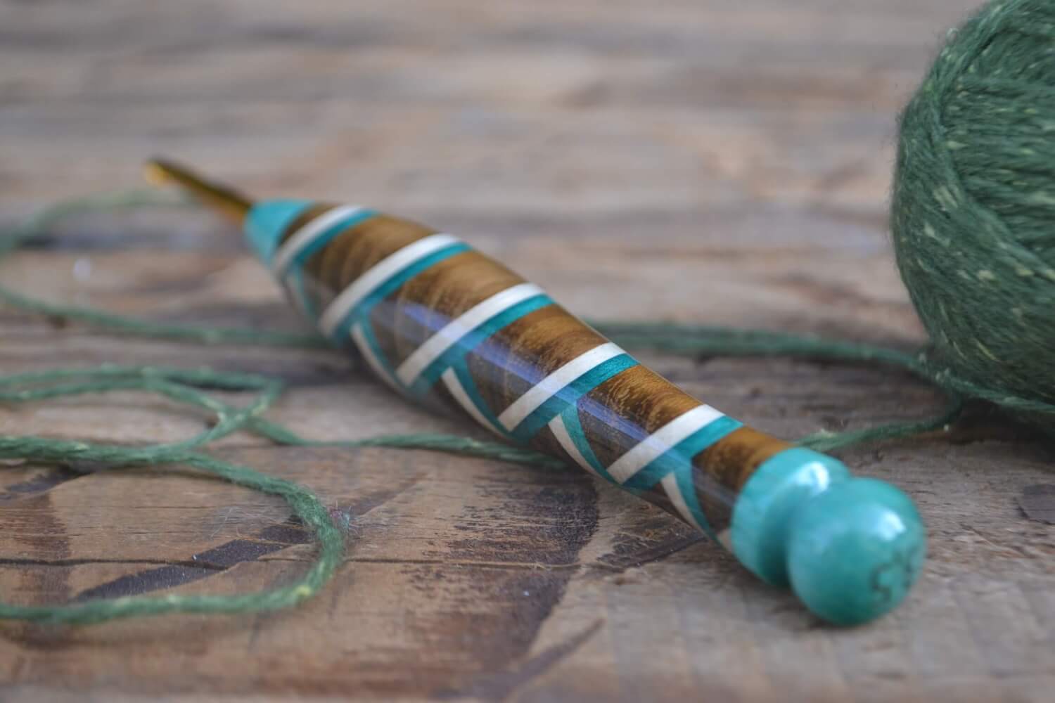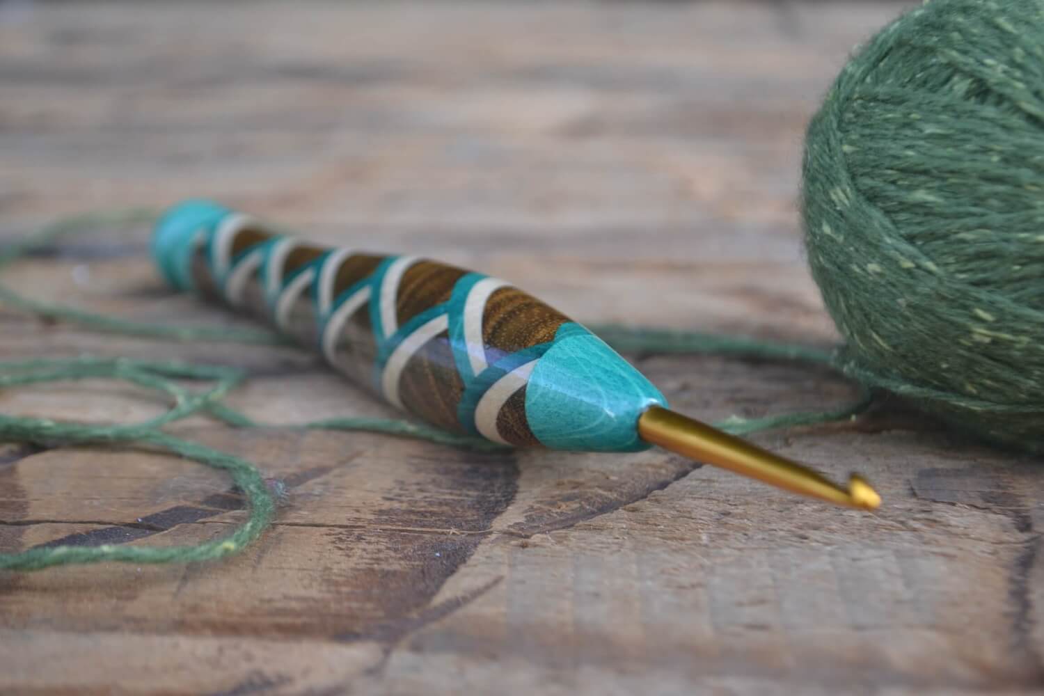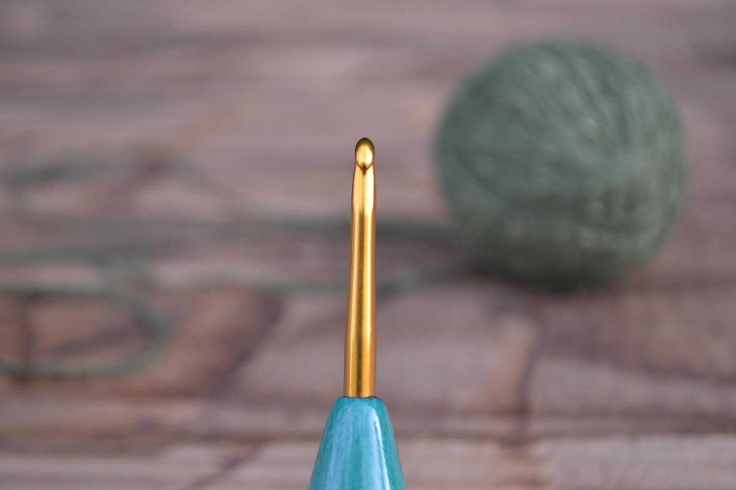 3.5 mm E Tulip Gold, Robinia/ Green & White Hornbeam wood mosaic Ergonomic Crochet Hook 21 mm 16.5 cm #1438-5128