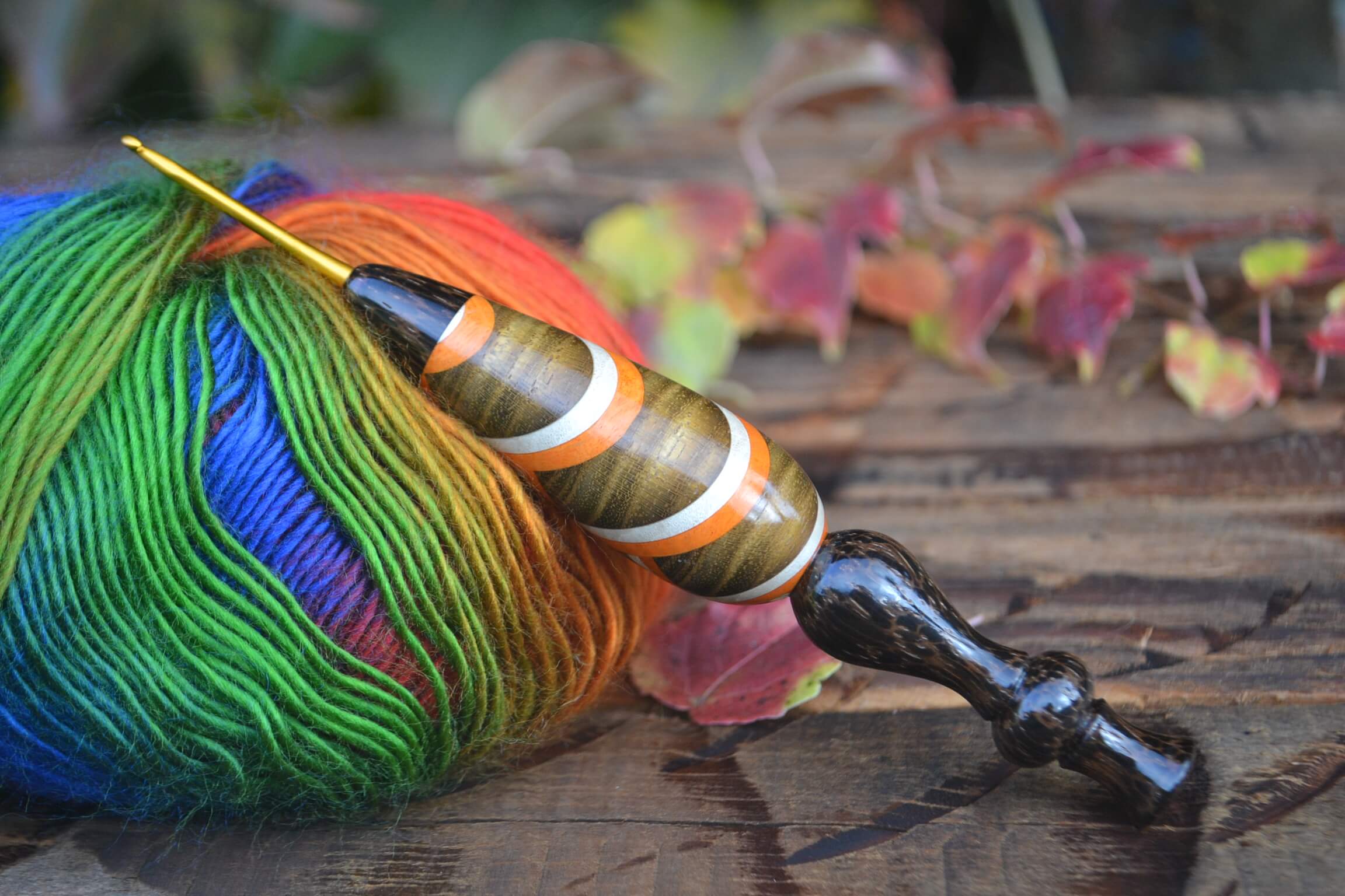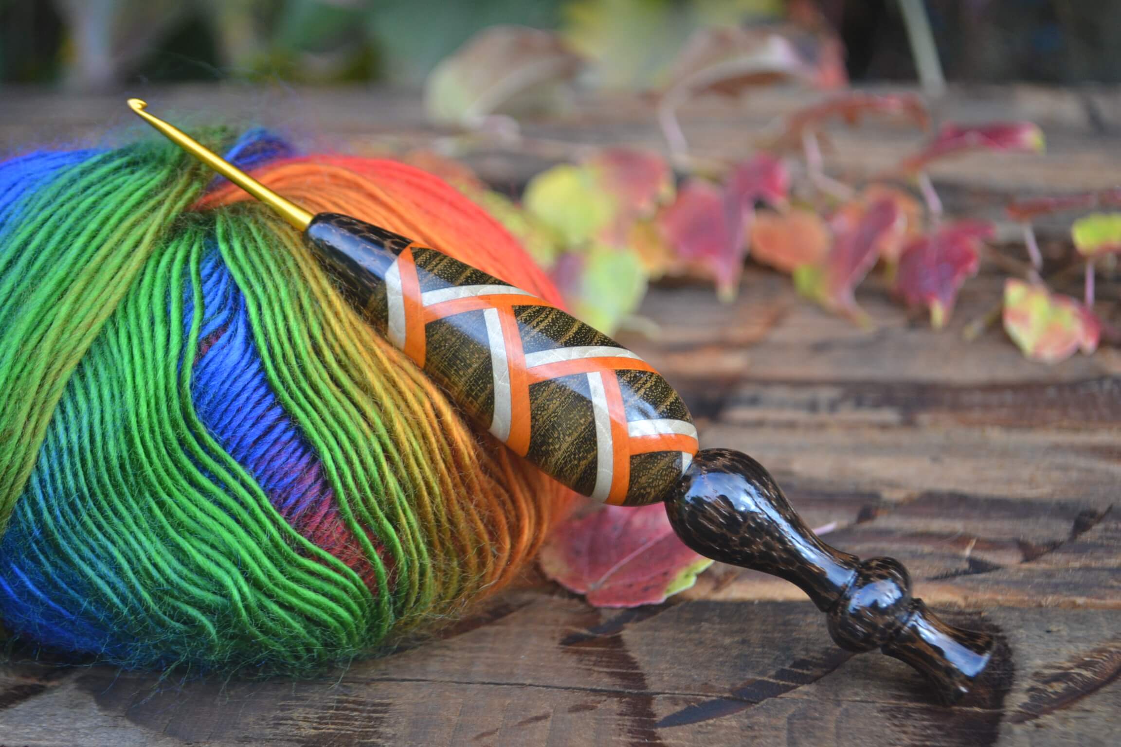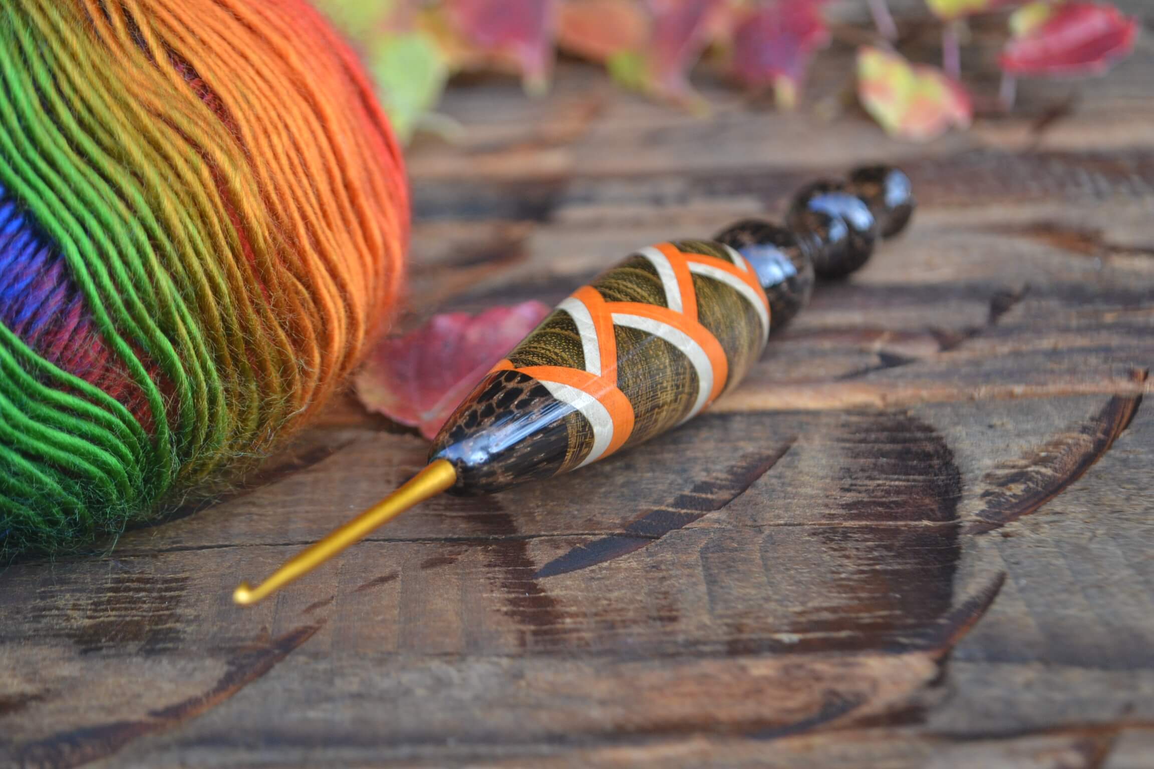 7.5 mm Black Hornbeam, Mosaic Robinia/Apricot/Hornbeam wood Ergonomic Crochet Hook 24 mm 17 cm # 1042-4732