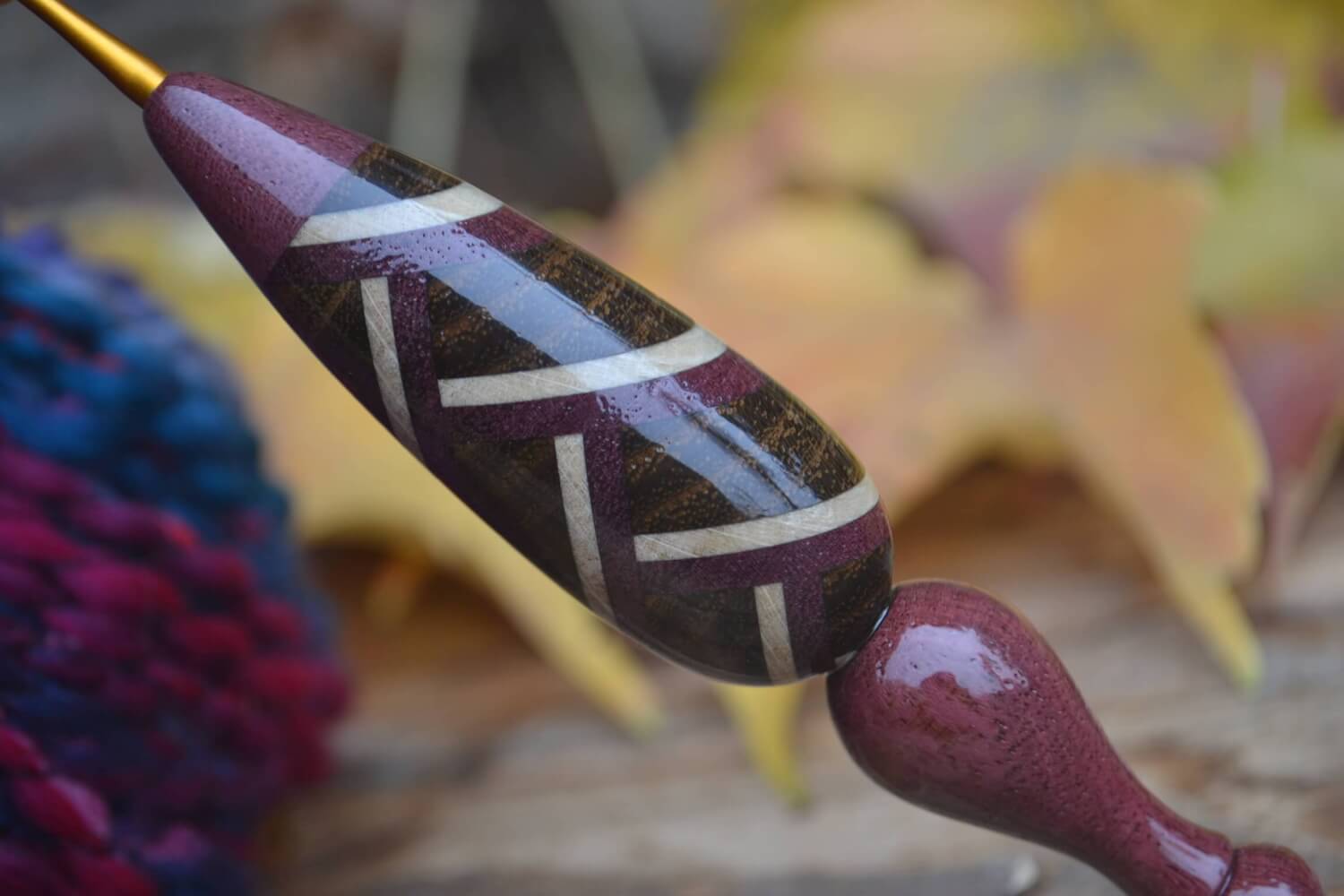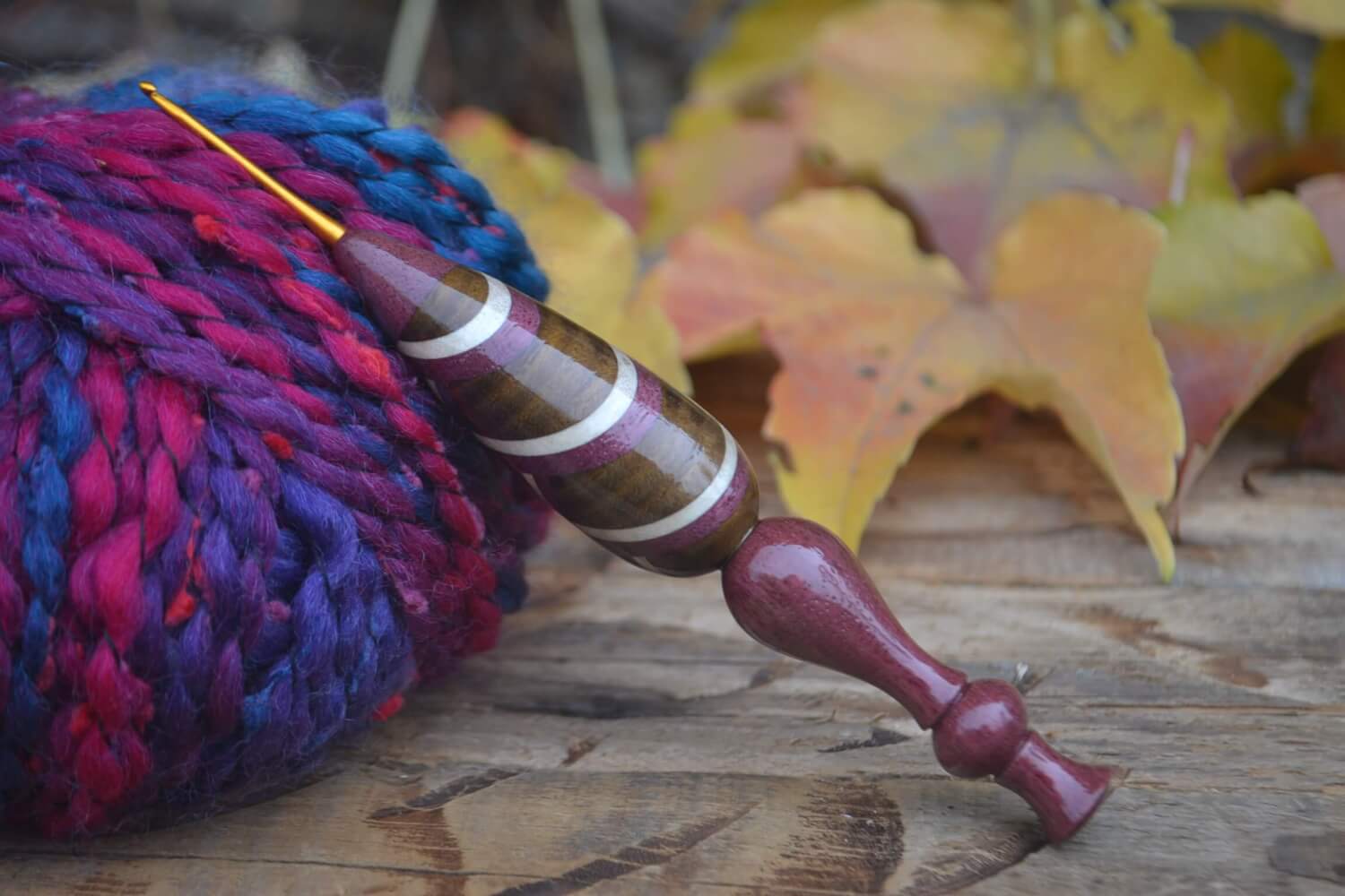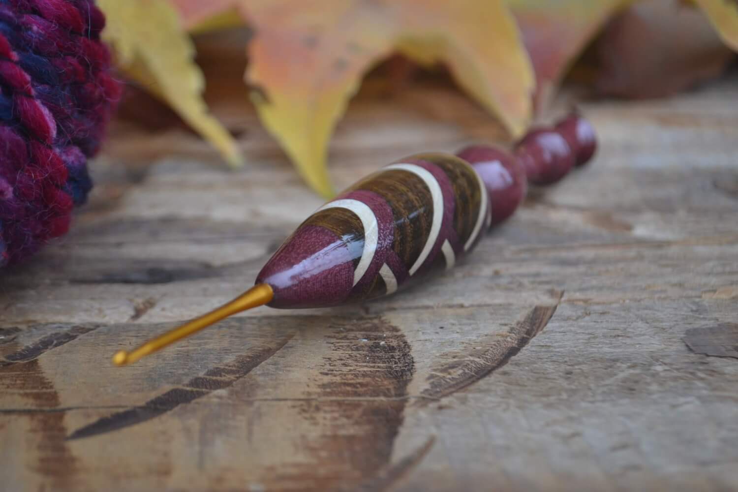 0.6 mm Clover steel, Purpleheart and Robinia/ Apple/ Hornbeam wood mosaic Ergonomic Crochet Hook 24 mm 16 cm #1128-4818