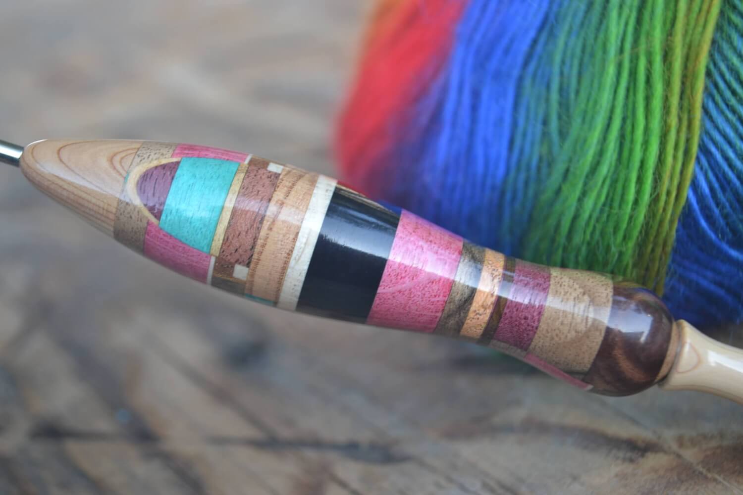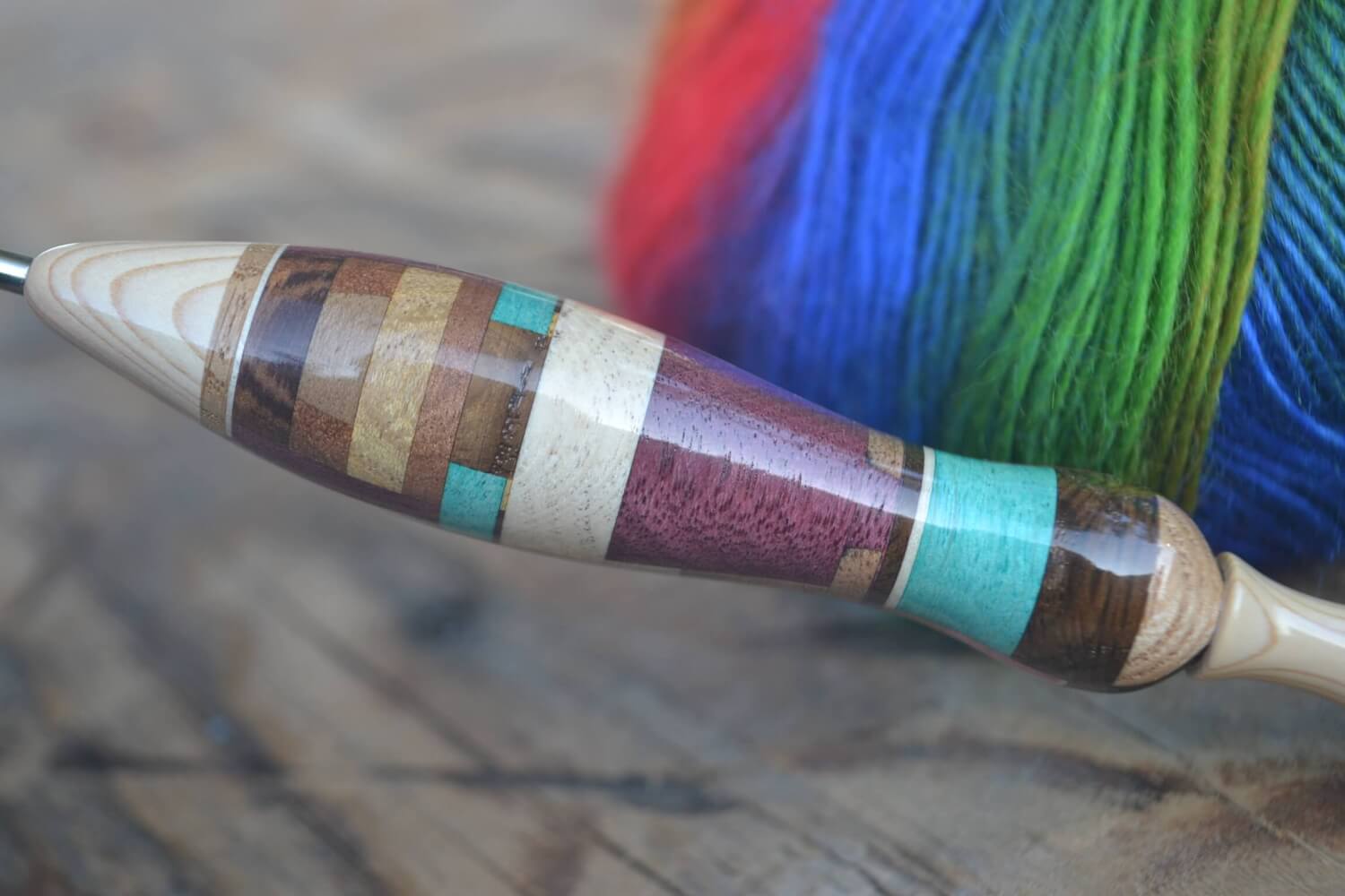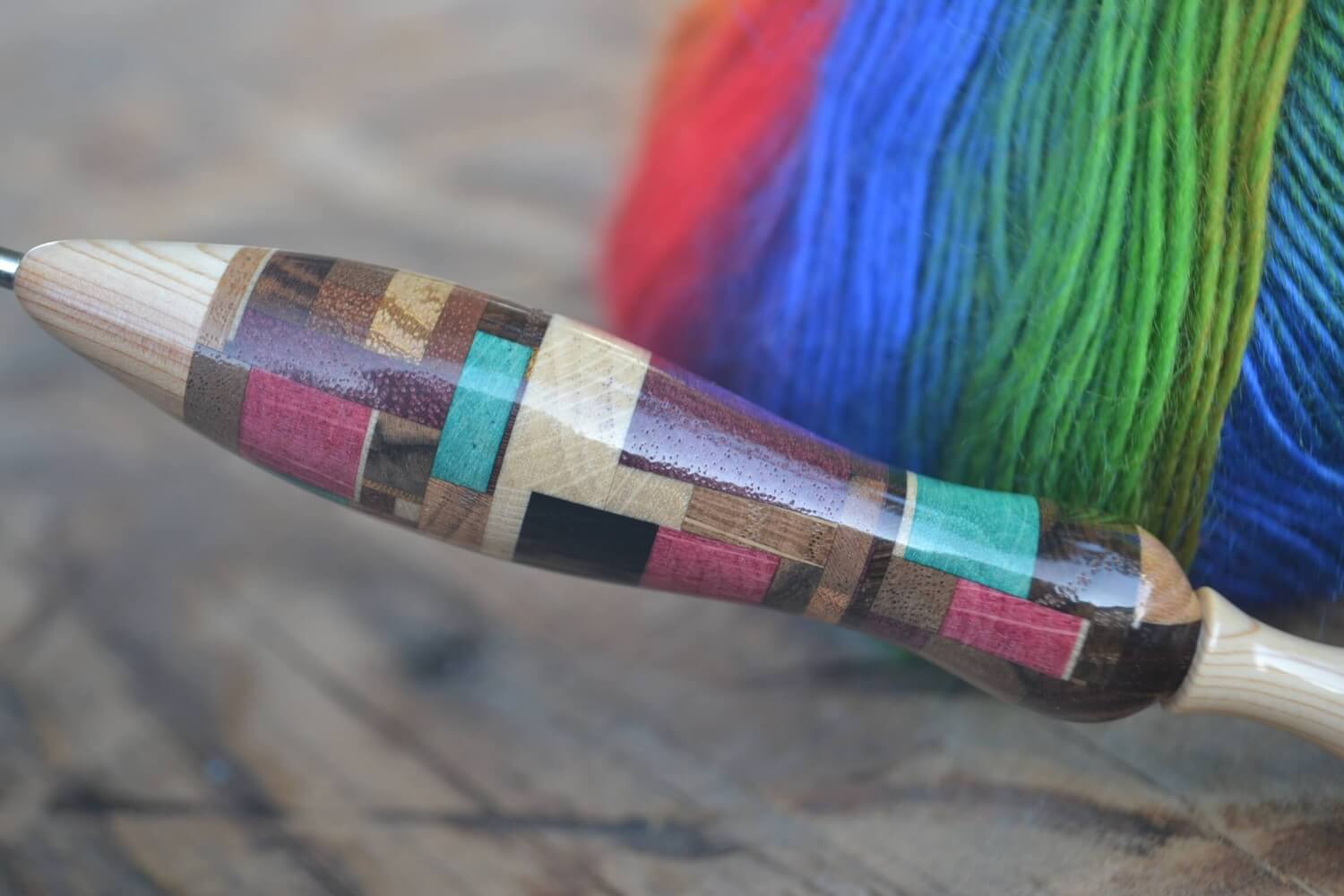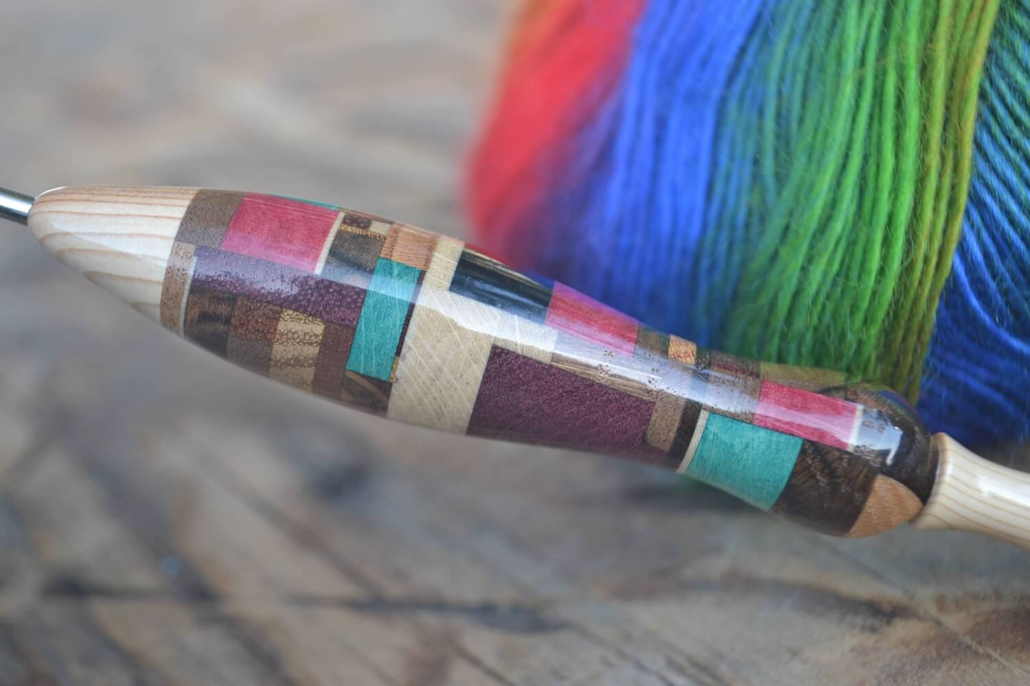 3 mm Tulip Gold, Bog Oak, Ash, Purpleheart, Hornbeam wood mosaic Ergonomic Crochet Hook 23 mm 17 cm #1343-5033