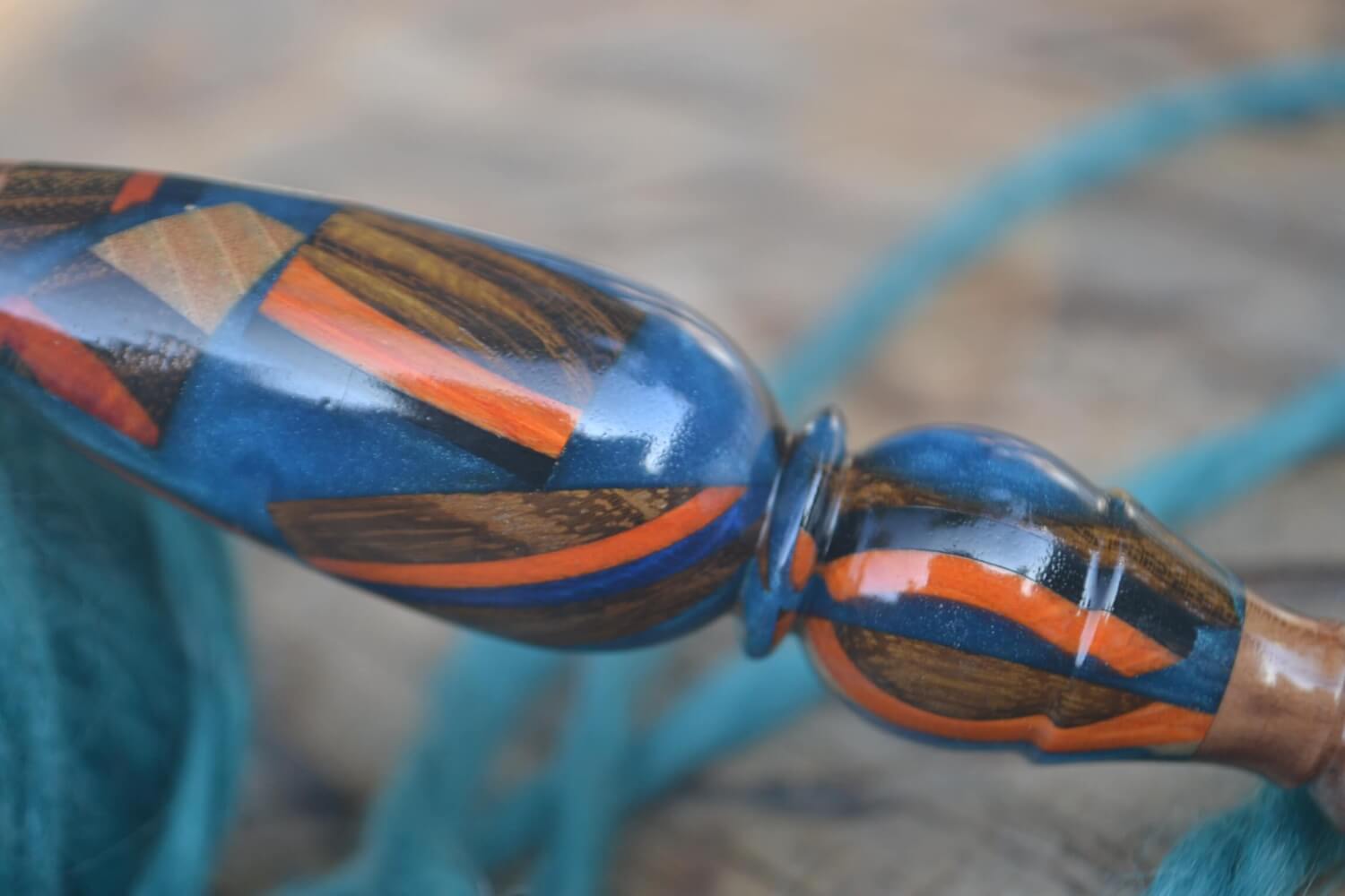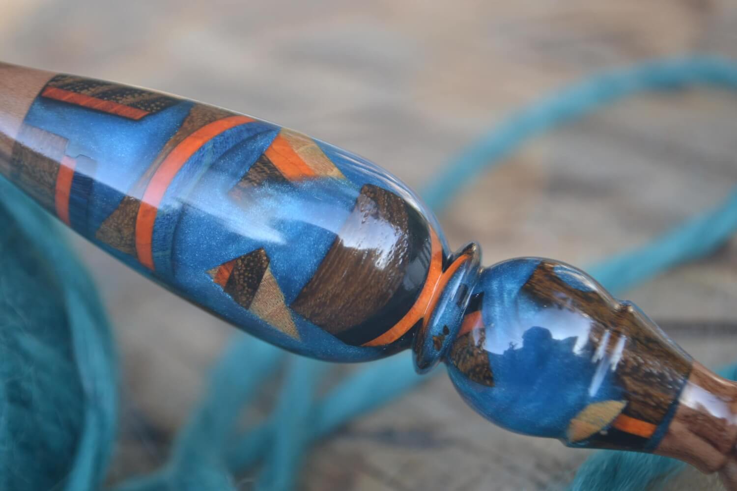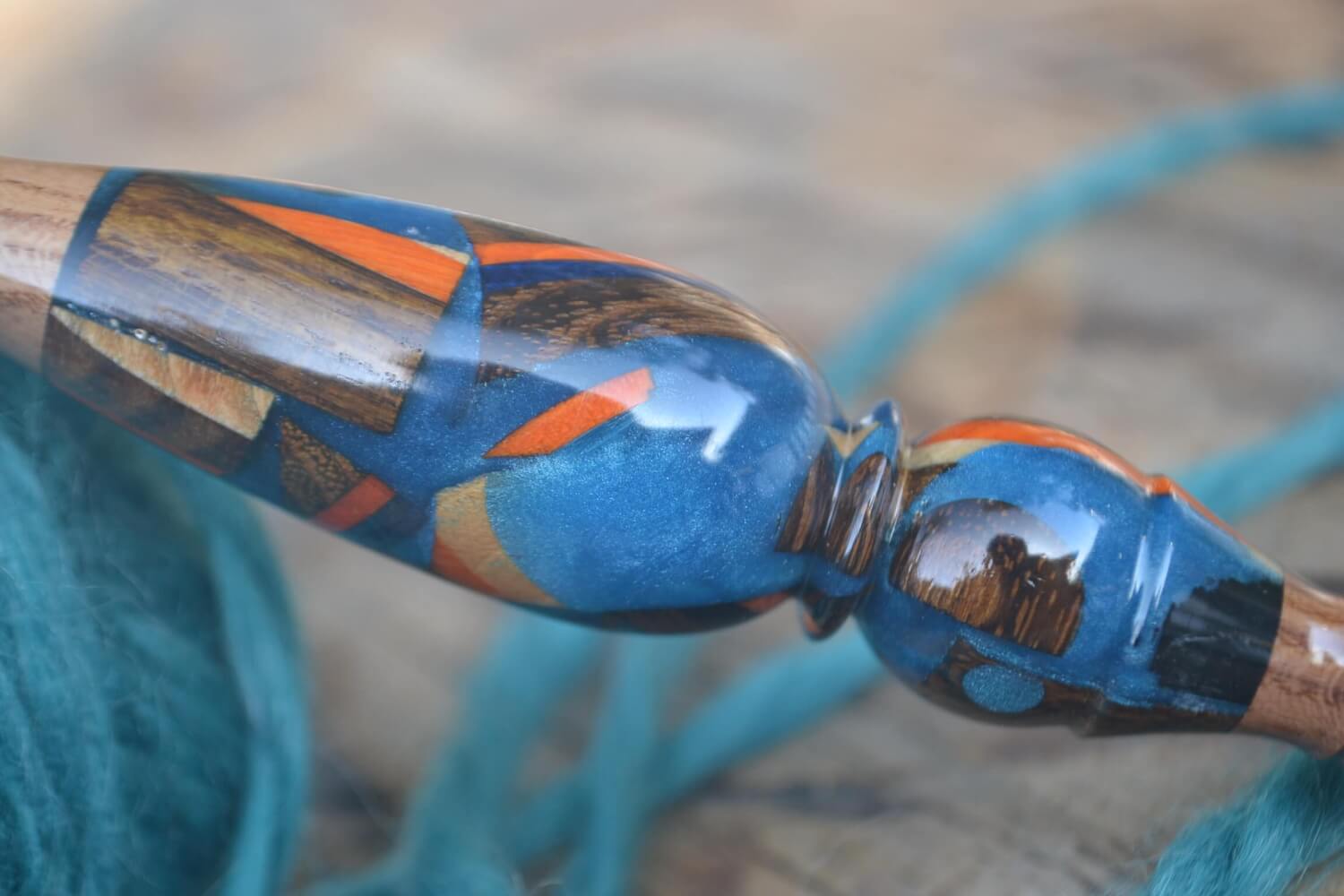 The handle features a unique design crafted from mixed wooden pieces of various species, beautifully embedded in epoxy resin.