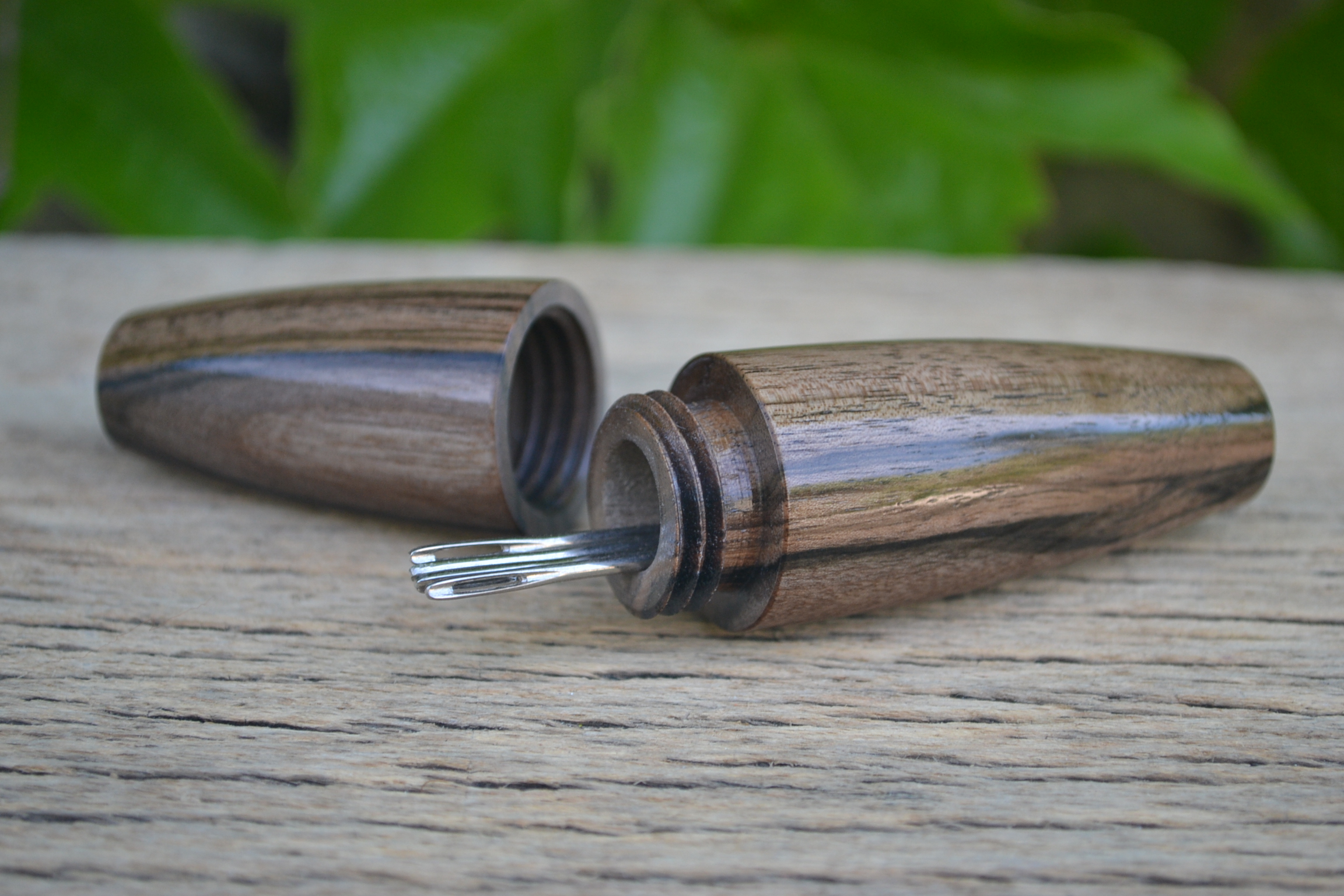 The sewing kit is hand turned of Pear wood. The item was sanded for a mirror finish and sealed with a safe clear varnish. The slim profile and small size fits conveniently in a small bag or pocket for the people on the go. Tight threaded screw-on parts make this item a secure holder for sewing and darning needles. Made in a single copy.