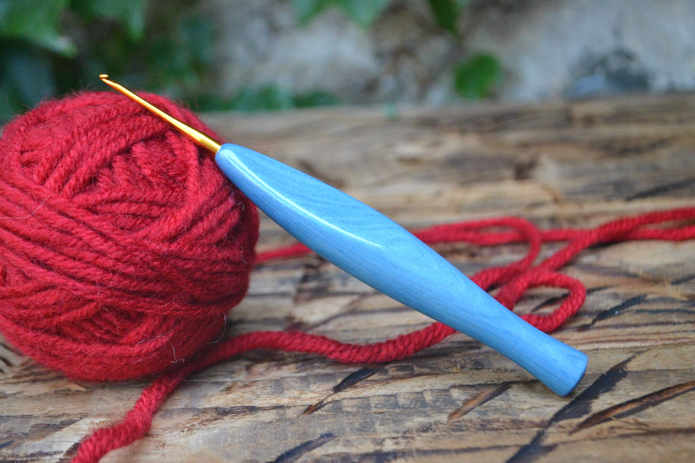 $27.002 mm Tulip Gold and Blue Hornbeam wood Ergonomic Crochet Needle 18 mm 14.5 cm #1286-4976