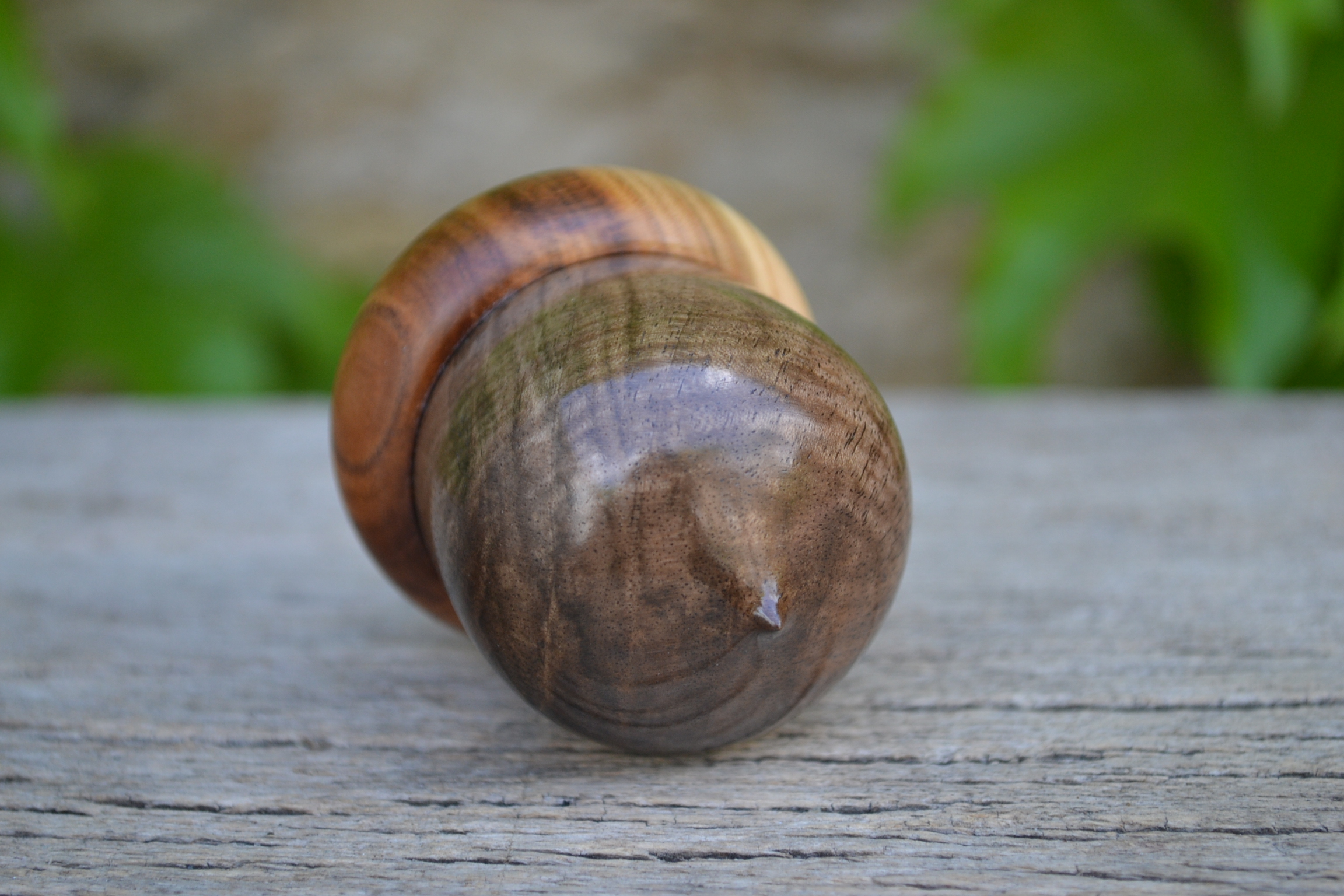 This is a realistic acorn shaped box made of greyish-beige Walnut wood, with a yellow-orange threaded screw-on cap of Apricot wood. It is individually hand turned, finished with clear safe gloss varnish ( for the body) and matte varnish ( for the cap).